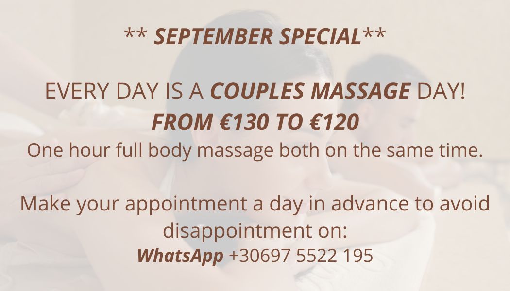 Hello my name is Bianca and i'm a certified masseuse and i'm glad to welcome you to Crete Massage & Wellness. We are a professional massage company located in Analipsi. Our passion for massage and wellness has led us to offer our services to both locals and tourists on the beautiful island of Crete. (we don't do erotic or happy ending massage)